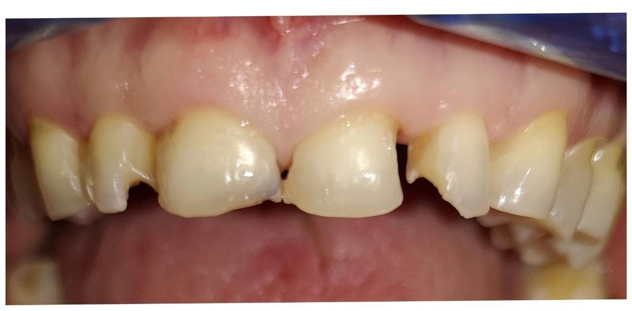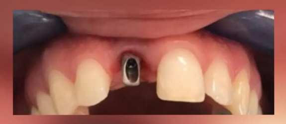 Intervento di implantologia orale su incisivo centrale superiore e posizionamento di corona estetica in ceramica pressata.