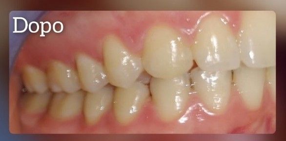 Disinclusione di un canino superiore. Il canino si trovava all’interno del palato e dopo esposizione chirurgica è stato trazionato in arcata con un apparecchio ortodontico, restituendo al paziente il suo sorriso.
